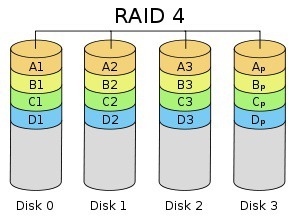 RAID 4도 현재는 거의 사용하지 않는 구성 방법이다. 블럭 단위의 스트래핑을 진행하며 1개의 패리티 디스크를 사용하는 방식이다.