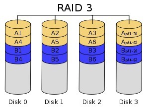 RAID 3은 바이트단위로 스트래핑을 진행하며 패리티 디스크를 1개 두는 방식이다. 바이트 단위로 쪼개어져, 너무 작은 단위로 분리된다는 문제가 발생하여 현재는 사용하지 않는 방법이다.
