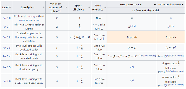 n+1개의 데이터 디스크와 n개의 패리티 디스크로 구성된다. 따라서 1개의 디스크가 손상되어도 복구가 가능하다.